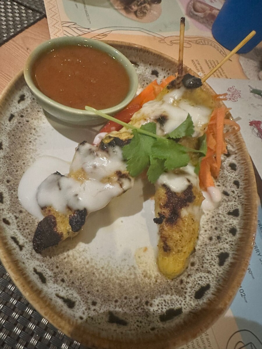 We ordered the Chicken Satay starter from Giggling Squid’s children’s menu for our young Minipreneur. The skewers arrive lacquered and glistening, the meat having been steeped patiently in coconut milk, lemongrass and fresh turmeric. It looked so good we just had to take a little bite for ourselves. The grilling does its work beautifully, imparting a gentle smokiness while keeping the chicken juicy and tender. Turmeric lends warmth rather than heat, lemongrass a citrusy lift, while the coconut milk rounds everything out. The peanut sauce is rich and comforting, nutty and faintly sweet, with enough salt and spice to prevent it tipping into cloying territory. This is satay done with care – simple, balanced and deeply satisfying.