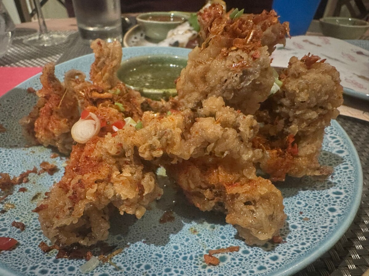 We begin, as one should, with Thai Prawn Crackers. Often an afterthought elsewhere, at Giggling Squid their pale shells carrying the unmistakable savour of real shrimp rather than anonymous starch. Made with tapioca flour and seasoned with garlic, sugar, salt and pepper, they crackle pleasingly between the teeth before melting away, leaving a whisper of sweetness and sea. Dunked into sweet chilli sauce, sticky with sugar and sharpened with heat, they do exactly what prawn crackers are meant to do – awaken the appetite and signal that good things are coming.