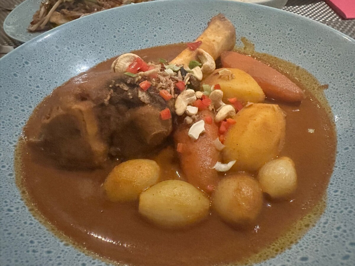 The Lamb Shank Massaman is a dish that demands both reverence and appetite. This is Thai cooking at its most opulent, a curry with Persian roots that found its way to the royal court in the 16th century and has been seducing diners ever since. The hearty shank has been cooked slowly until the meat collapses at the merest touch of a spoon. The sauce is thick, rich and perfumed, coconut milk carrying the warmth of cardamom, cinnamon and star anise, with nutmeg adding depth. Potatoes and carrots soak up the gravy, while crunchy cashew nuts provide textural contrast. Mild, sweet and deeply comforting, it is a curry that wraps itself around you, less fiery than many Thai dishes but no less complex. This is food to linger over, preferably with good company and no need to rush.