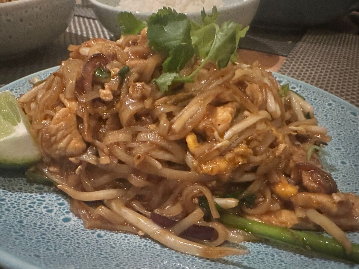 Pad Thai, that most famous of Thai noodle dishes, arrives steaming and generous. Invented in the 1930s as a unifying national dish, it remains a masterclass in balance. At Giggling Squid, the rice noodles are slicked with sauce and tossed with tofu, beansprouts, sliced red onion and Thai chives. Crunchy peanuts add texture, while fish sauce provides the crucial umami backbone, savoury and faintly funky. There is sweetness, acidity and salt in perfect proportion, each mouthful nudging the next. It is a confident rendition of a classic, respectful of tradition while delivering sheer pleasure.