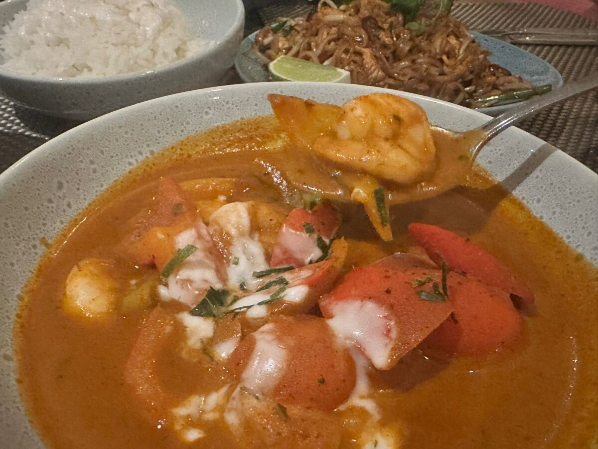 The Prawn Paneang Curry offers a different expression of Thai richness. Thickened with coconut milk and ground peanuts, the sauce clings luxuriously to plump prawns, its flavour layered with roasted cumin and coriander seeds. Lime leaves and shrimp paste provide that unmistakable Thai depth, while a gentle sweetness distinguishes it from a standard red curry. Silky and aromatic, it manages to be indulgent without heaviness, the prawns retaining their snap and sweetness against the creamy backdrop. It is easy to see why this curry is so beloved in Thailand – comforting, fragrant and quietly addictive.
