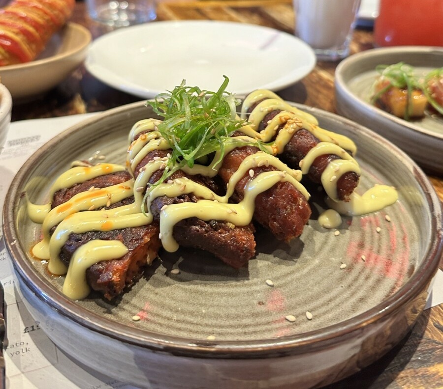 However, the star of the Small Eats section was undoubtedly the Bacon Mochi. These caramelised bacon-wrapped rice cakes, adorned with gochujang caramel and spring onions, were an umami explosion. The sweet, sticky glaze combined with the smoky bacon was nothing short of genius, whetting our appetites for the main event.