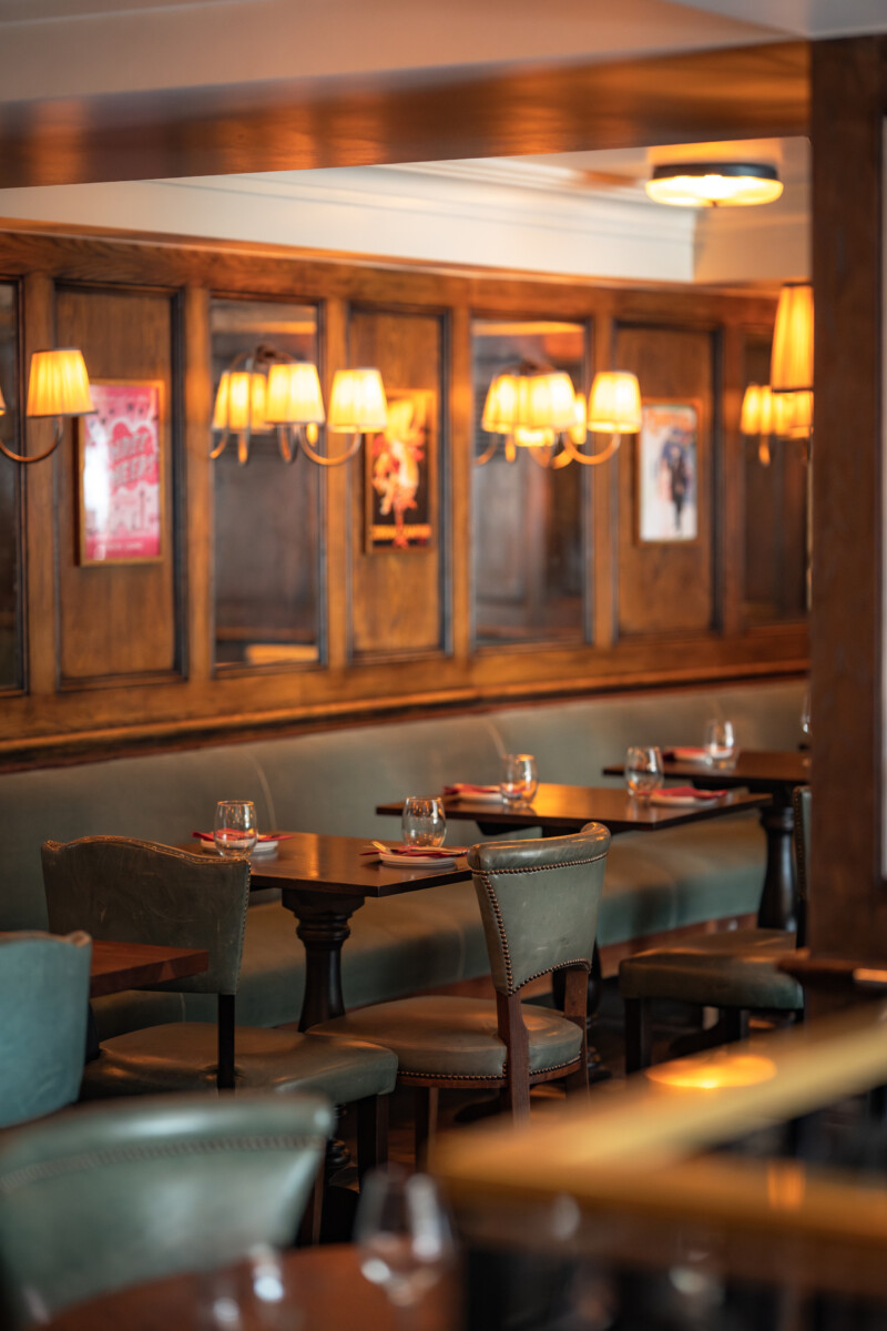 Dark wood panelling, green leather seating and walls dressed in posters from neighbouring stages create a space that hums with anticipation.