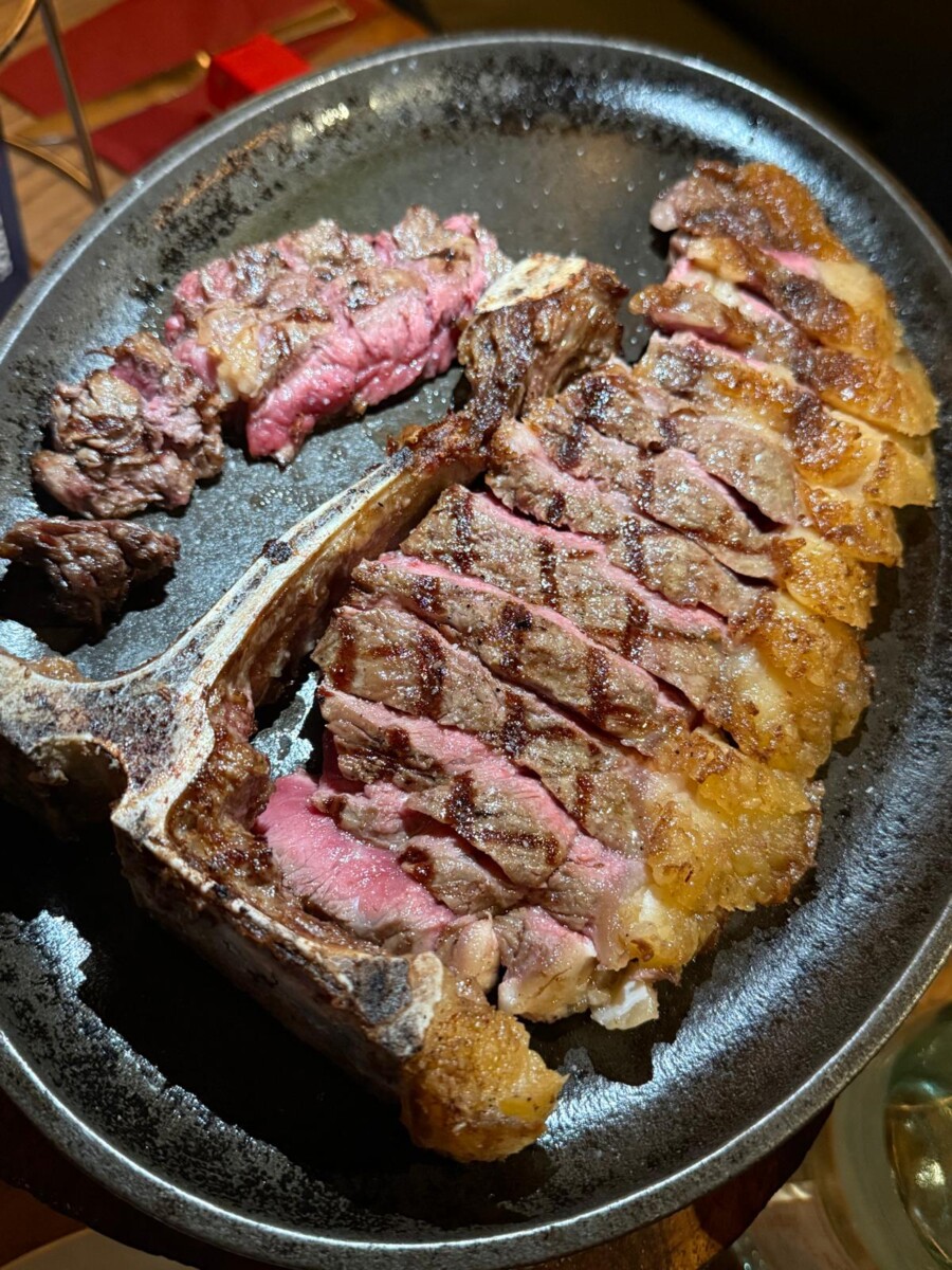 But it is the steaks that command reverence. The 600g Costata, a dry-aged Marango ribeye on the bone, arrives pre-cut and glistening. Cooked medium-rare, the marbling melts into the flesh, delivering an intense buttery richness and pronounced mineral backbone. The exterior carries a charred crust, giving way to a juicy, tender interior. It is bold, robust and unapologetically beefy.