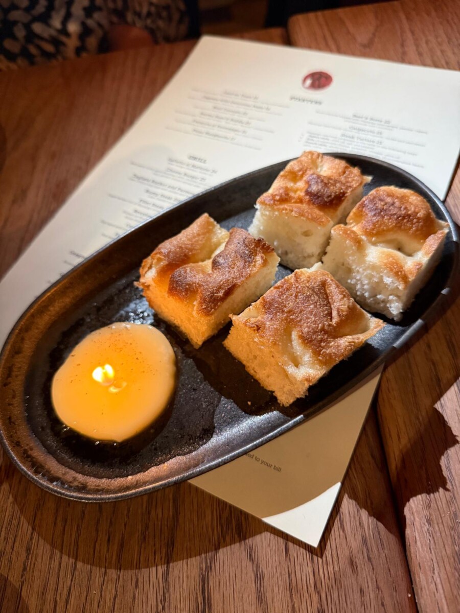 On our visit to Macellaio RC Soho, glasses of Prosecco are served almost as soon as we’ve sat down at our table. Nibbles arrive just as promptly – plump green olives and a plate of warm Focaccia, served with a lard candle slowly melting into a glossy pool for dipping. It is a clever, decadent touch – the warm bread tearing open to reveal airy crumb, the lard lending a silky, savoury richness that feels both rustic and indulgent.