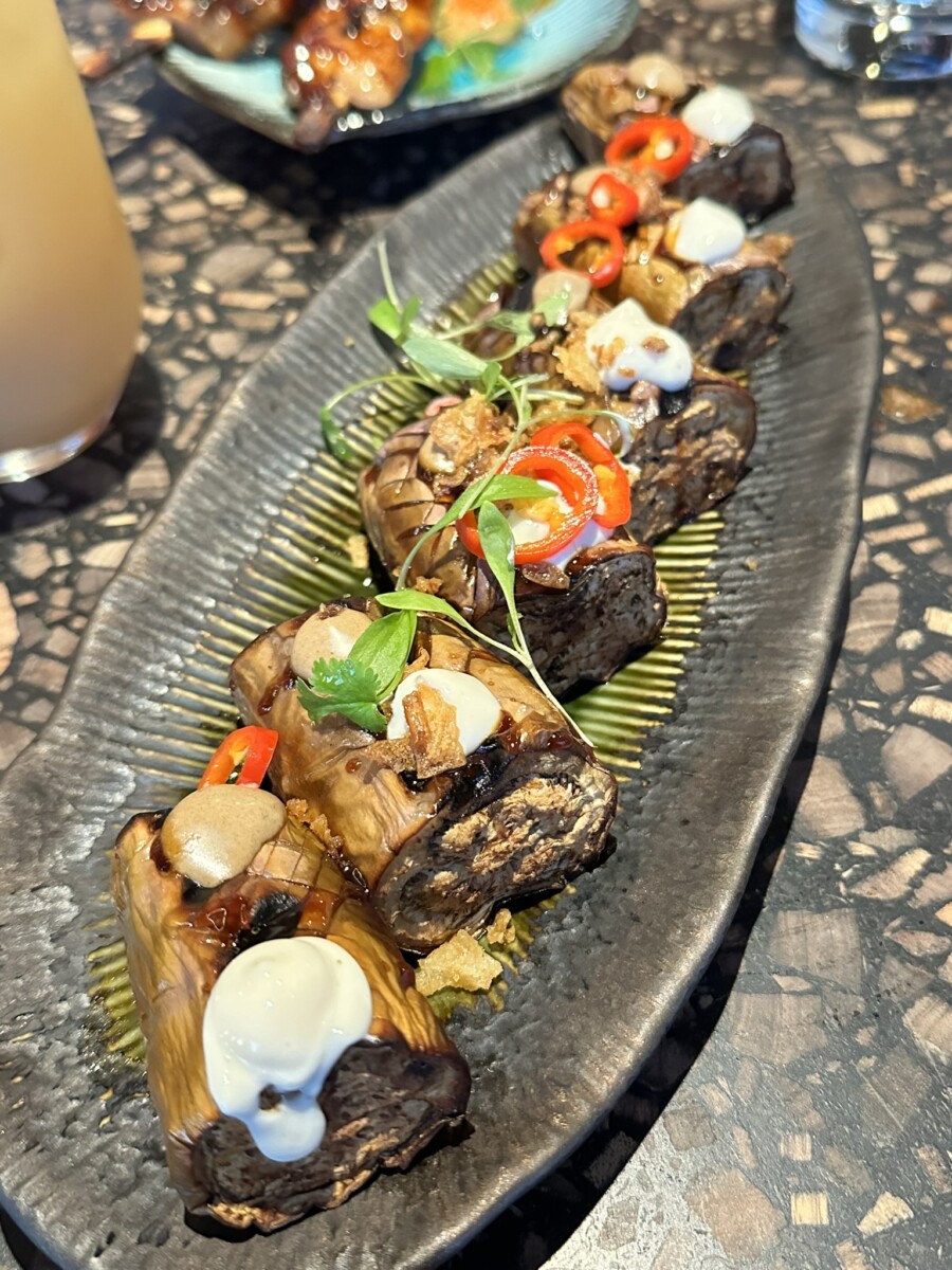 Vegans will love the Japanese Aubergine with black garlic, truffle, whipped tofu, crispy shallots and citrus dressing.