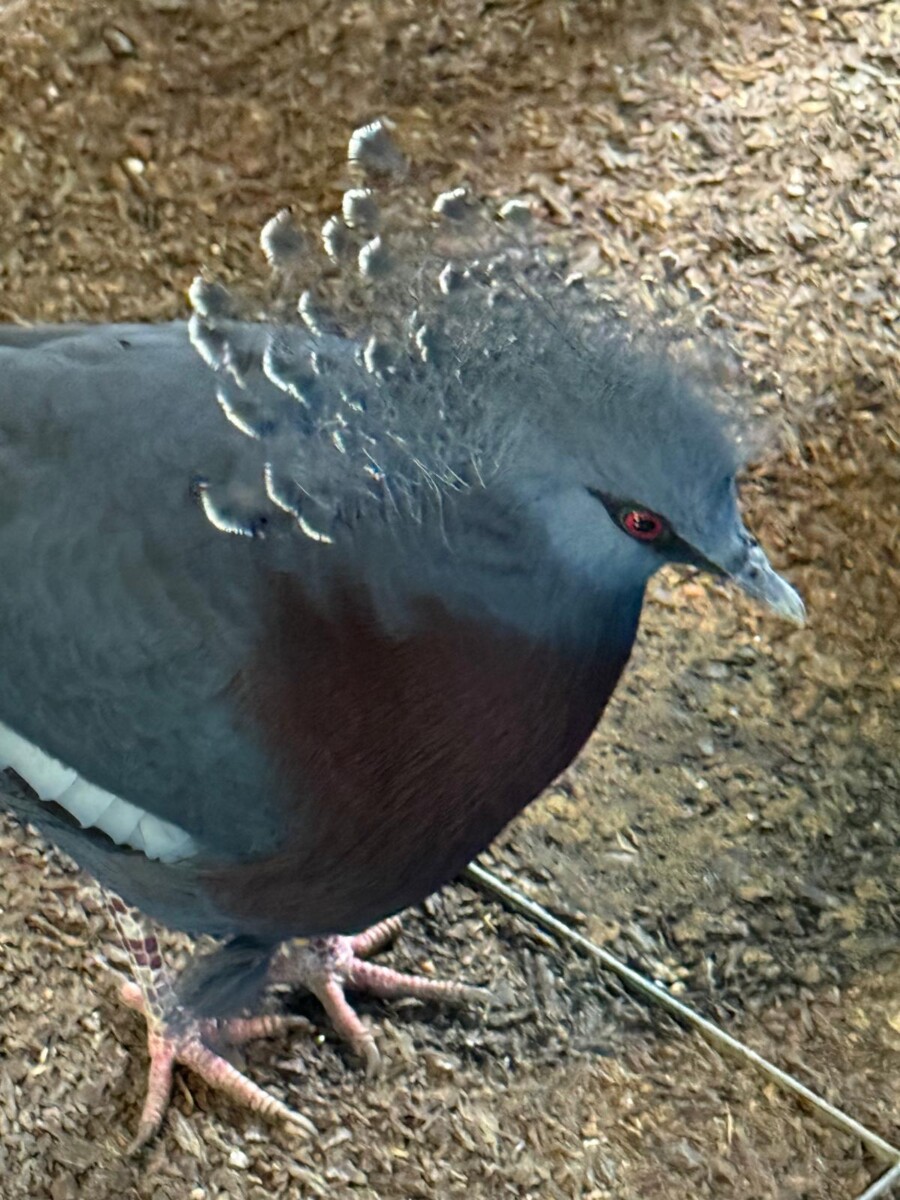 In the Butterfly House, a regal Victoria Crowned Pigeon strutted proudly among the tropical greenery. With its striking blue plumage and elegant crown of lacy feathers, this bird is one of the most beautiful pigeons in the world. Native to the rainforests of New Guinea, it’s a gentle giant of the bird world that captivates children with its graceful movements and soft cooing calls.
