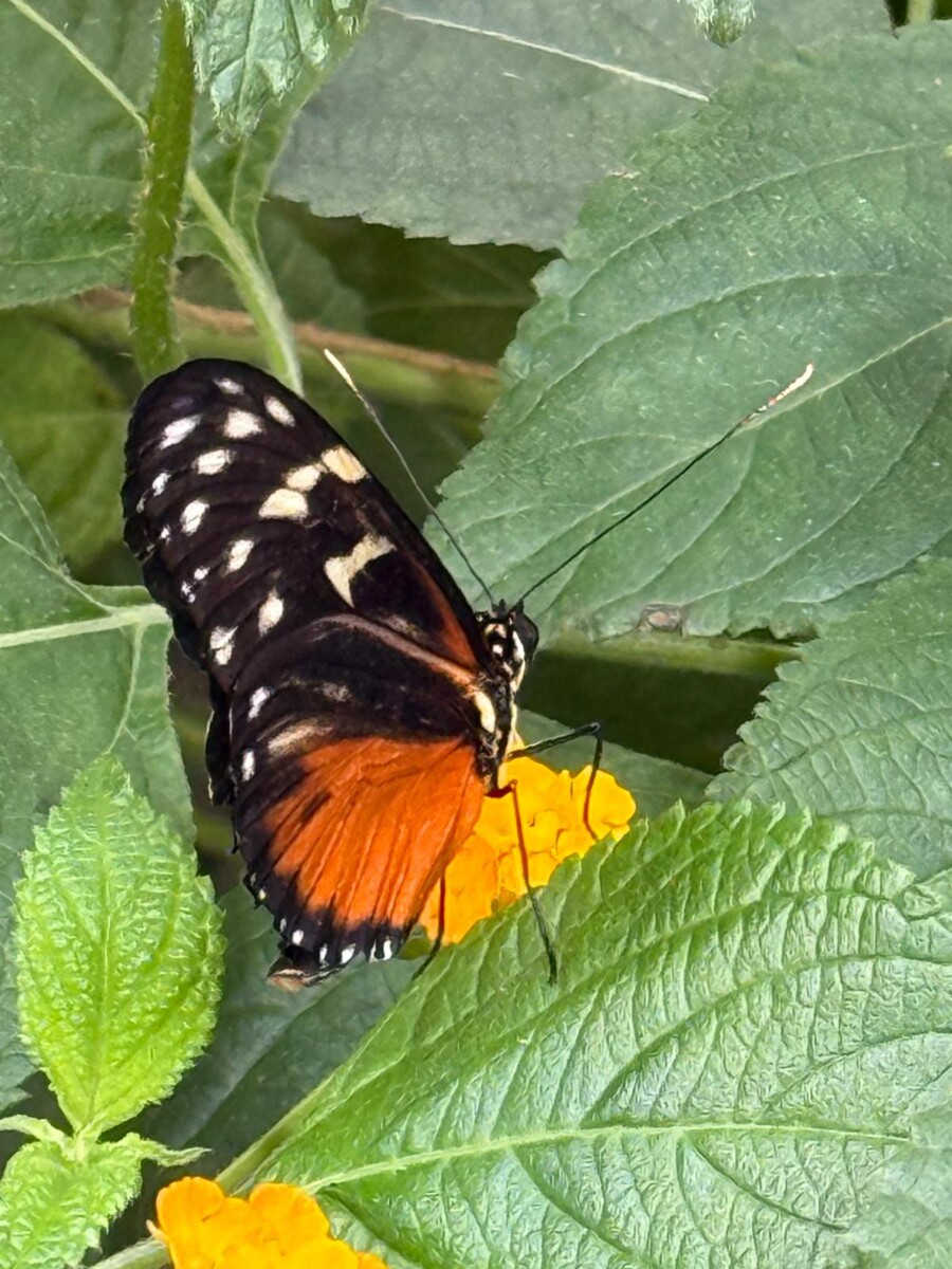 With its bold orange-and-black stripes, the Tiger Longwing adds a flash of tropical brilliance to the Butterfly House. These striking butterflies are known for their slow, graceful flight and for feeding on nectar-rich flowers. Their vivid colouring isn’t just beautiful – it warns predators that they taste unpleasant, a clever survival trick.
